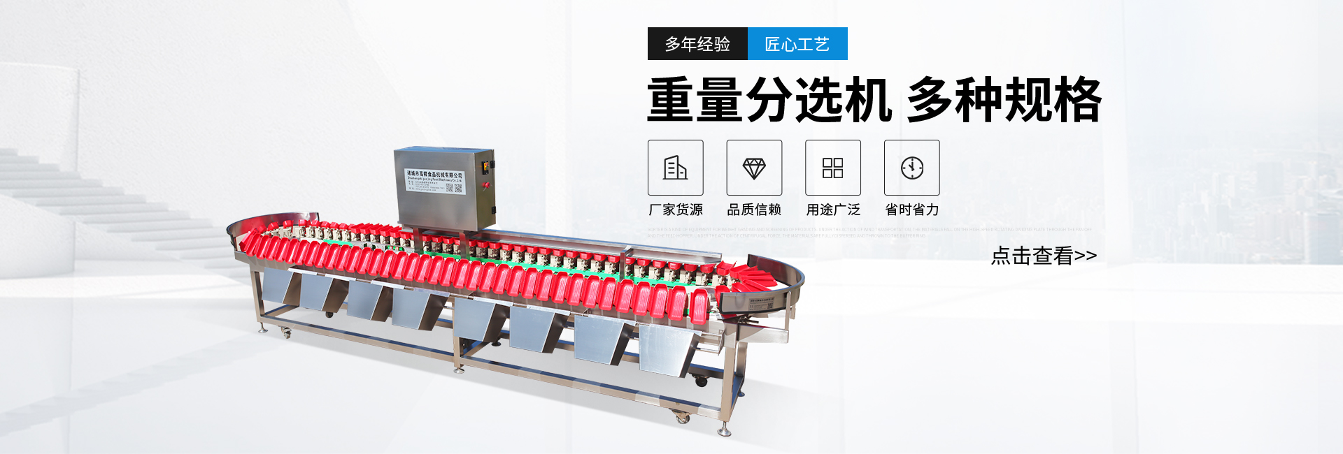 公司主要致力分選機(jī)的研發(fā)和設(shè)計(jì),并獲得多項(xiàng)專利,有皮帶式稱重分選機(jī)、托盤式稱重分選機(jī),廣泛應(yīng)用于食品、水產(chǎn)、電子、中藥等各種需要精確分選的行業(yè),并獲得了廣大客戶的好評。